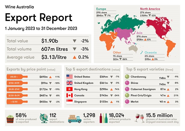 In 2023, the value of Australian wine exports declined 2% to $1.9bn AUD while volumes declined 3% to 607 million litres.